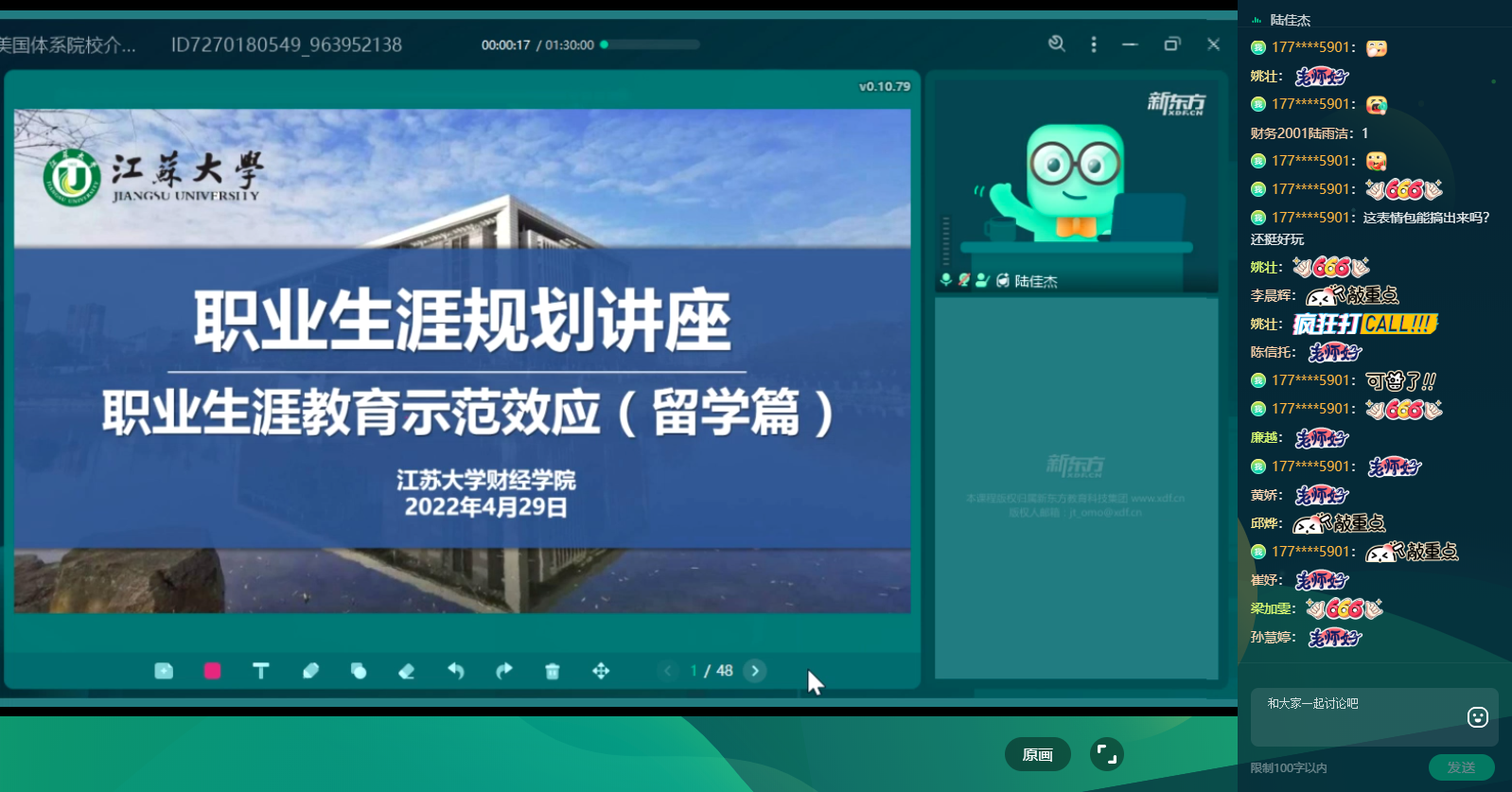 为了进一步拓展当代大学生的国际视野,提高学生升学质量,帮助学生提前做好留学规划,以实现名校梦想。4月29日晚,财经学院线上举办线上职业生涯指导之留学讲座,主讲人为新东方留学规划师陆佳杰,20级辅导员林汉连主持,2019、2020级学生参加。