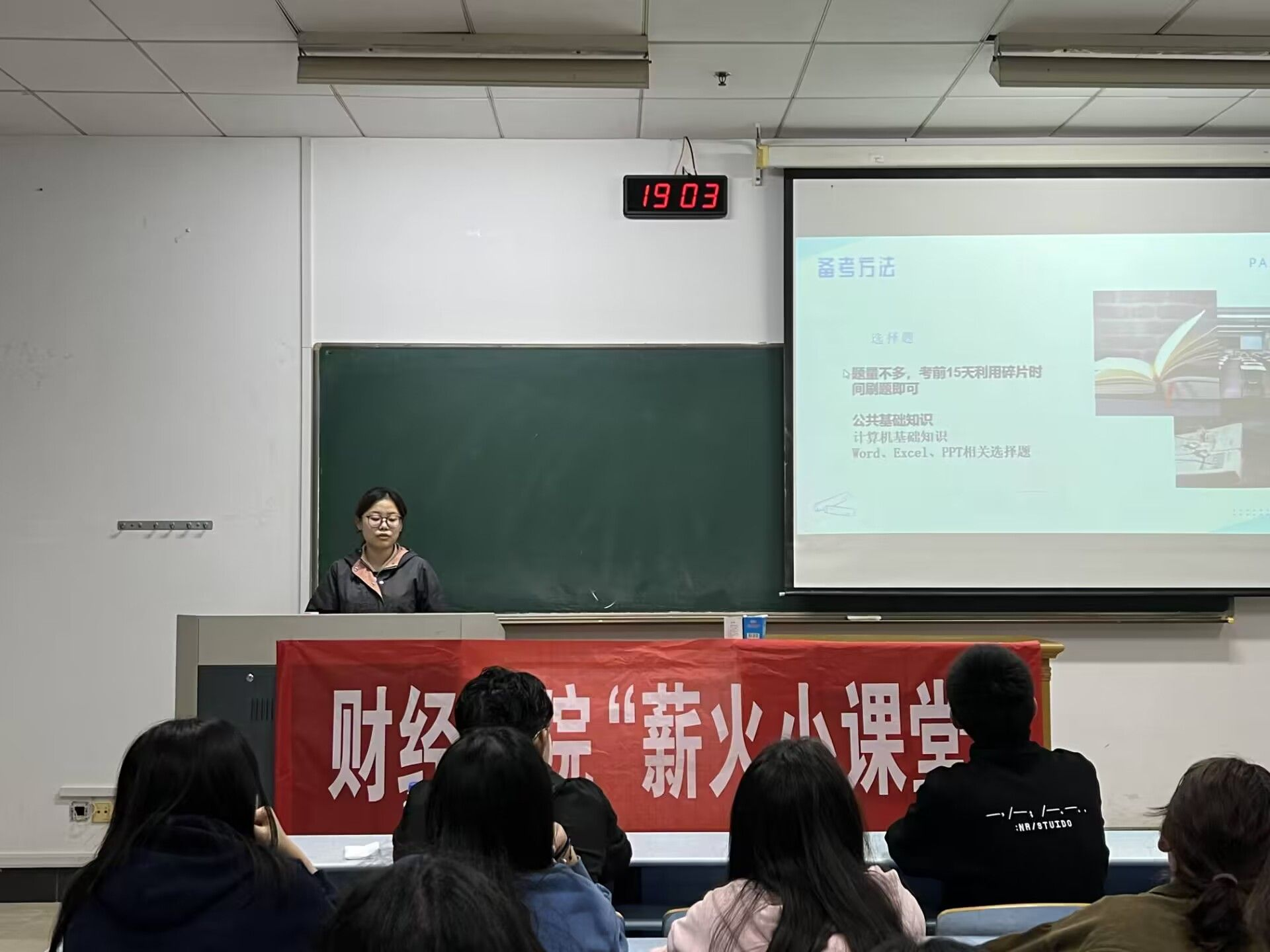 为帮助同学们提高计算机学习能力,调动学习积极性,4月14日,财经学院在三江楼302教室举办“薪火小课堂”活动。本次活动由会计2203张芊荟担任讲师,为同学们讲解计算机学习的技巧,传授学习经验。