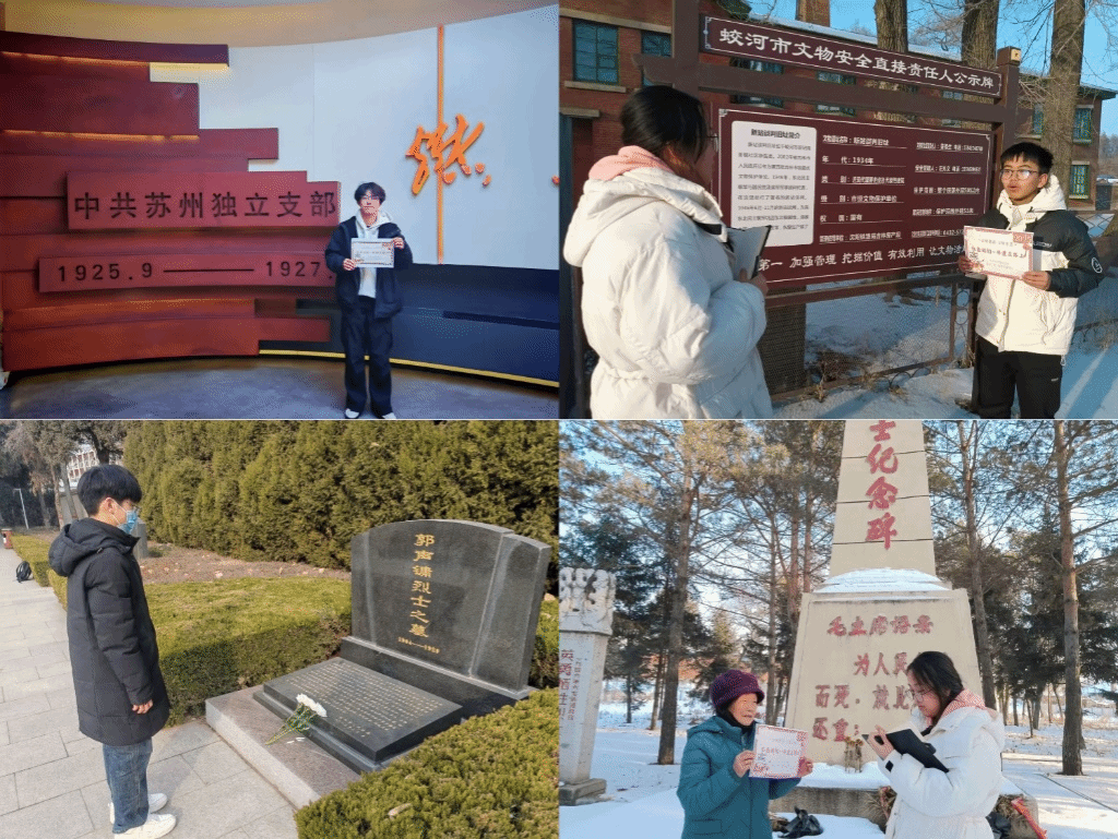 财经学院组织团队前往家乡红色遗址、先辈故居、非遗文化纪念馆等地,回溯革命历史,体悟先辈爱国奉献的精神。在中共苏州独立支部遗址,志愿者观看舞台剧《姑苏烽火》,重温苏州革命历程和革命先烈的英勇事迹;在吉林新站谈判旧址,在与当地人员的交流中,志愿者深入了解了“拉新战役”,体会到革命文化的深厚内涵;走进安阳市烈士陵园,志愿者瞻仰人民英雄纪念碑,研读碑文,表达对烈士的崇高敬意与对红色历史的深切缅怀。
