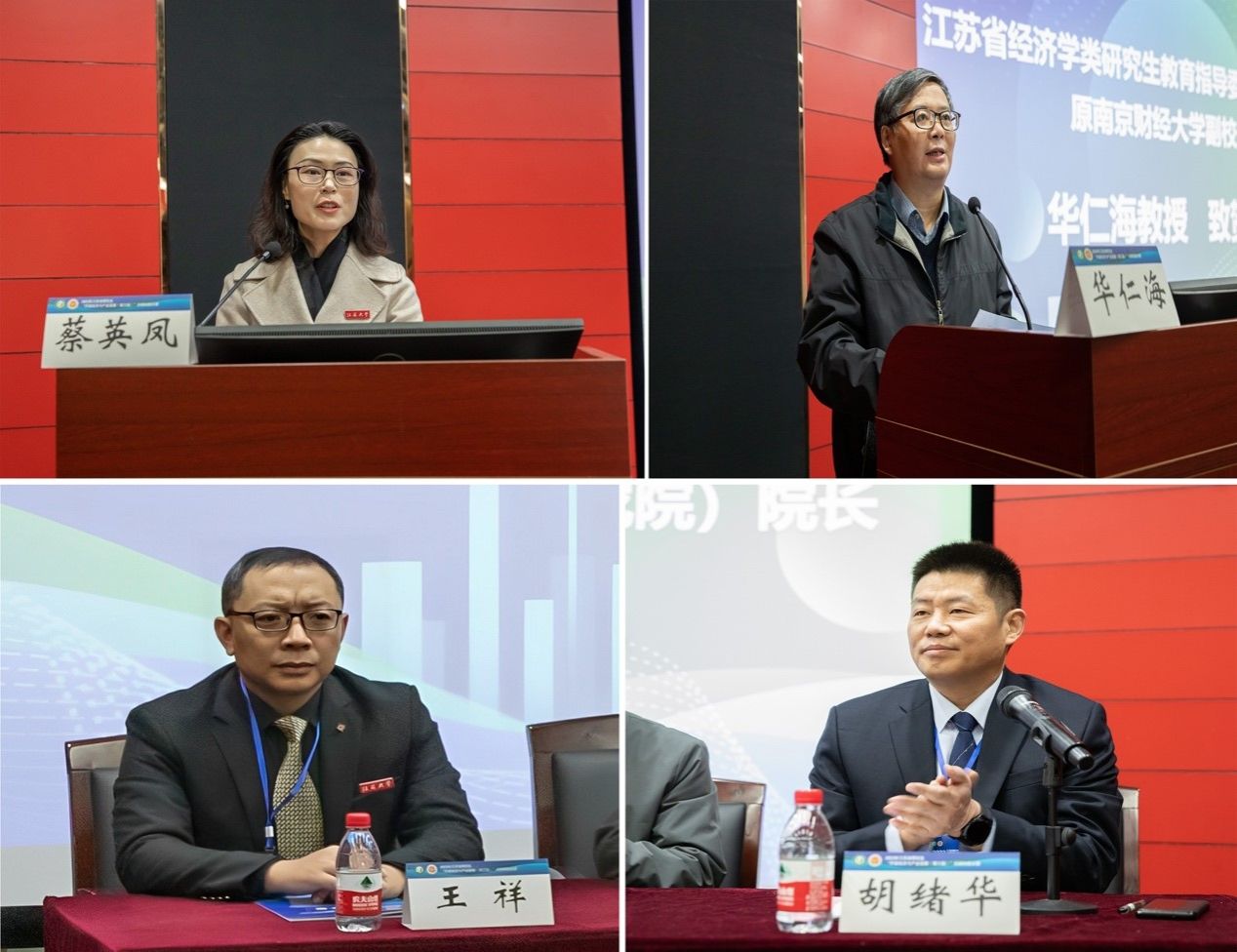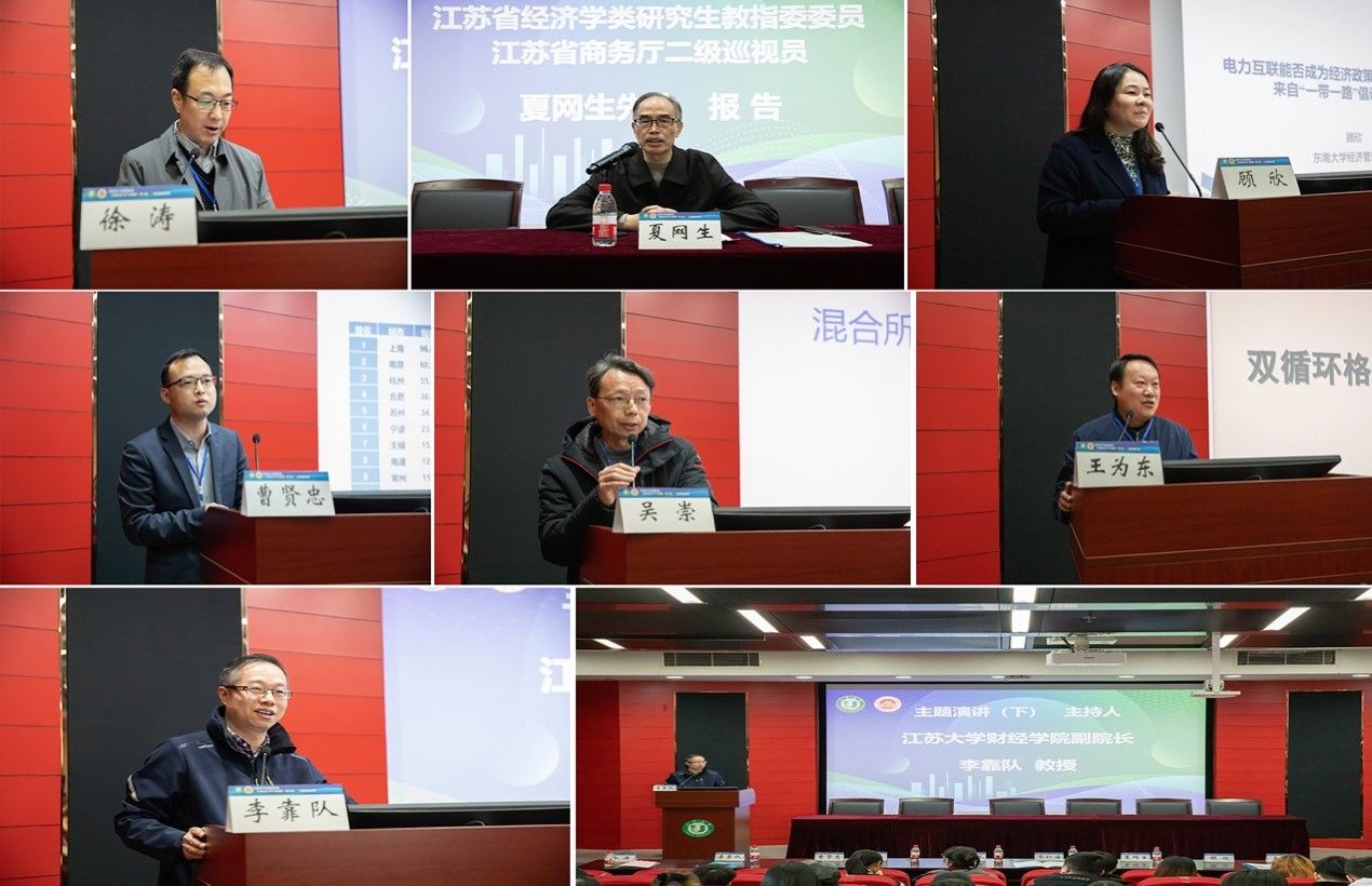 开幕式后,江苏省经济学类研究生教育指导委员会委员、江苏省商务厅二级巡视员夏网生先生,东南大学青年特聘教授、博士生导师、江苏省决策咨询基地首席专家顾欣教授,华东师范大学城市发展研究院院长助理、博士生导师、上海市高校重点智库上海城市发展协同创新中心副主任曹贤忠教授,民盟江苏省委教育工作委员会委员、南京信息工程大学商学院吴崇教授,江苏大学财经学院国际经济与贸易系主任王为东教授5位专家依次作了主题演讲。主题演讲环节分上下两场进行,分别由徐涛教授和李靠队教授主持。
