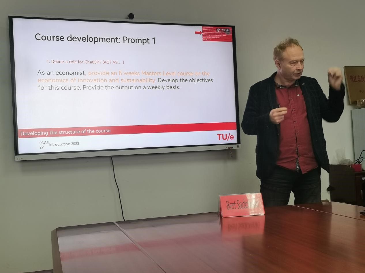 Bert Sadowski教授从课程体系设计、头脑风暴、支撑文献建议、作业分配、作业检查等方面介绍了Chat GPT的原理和功能,并结合案例进行了现场指导。讲座结束后,各位留学生和青年教师积极参与互动和交流,Bert Sadowski教授一一回答了他们提出的问题和话题。