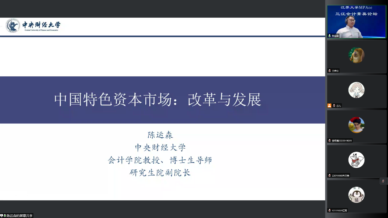 5月20日,中央财经大学研究生院副院长陈运森教授做客江苏大学三江会计菁英论坛,为我校MPAcc学生作了主题为“中国特色资本市场:改革与发展”的报告。论坛由江苏大学副校长张济建教授主持,二百余名师生通过腾讯会议参加了此次讲座。