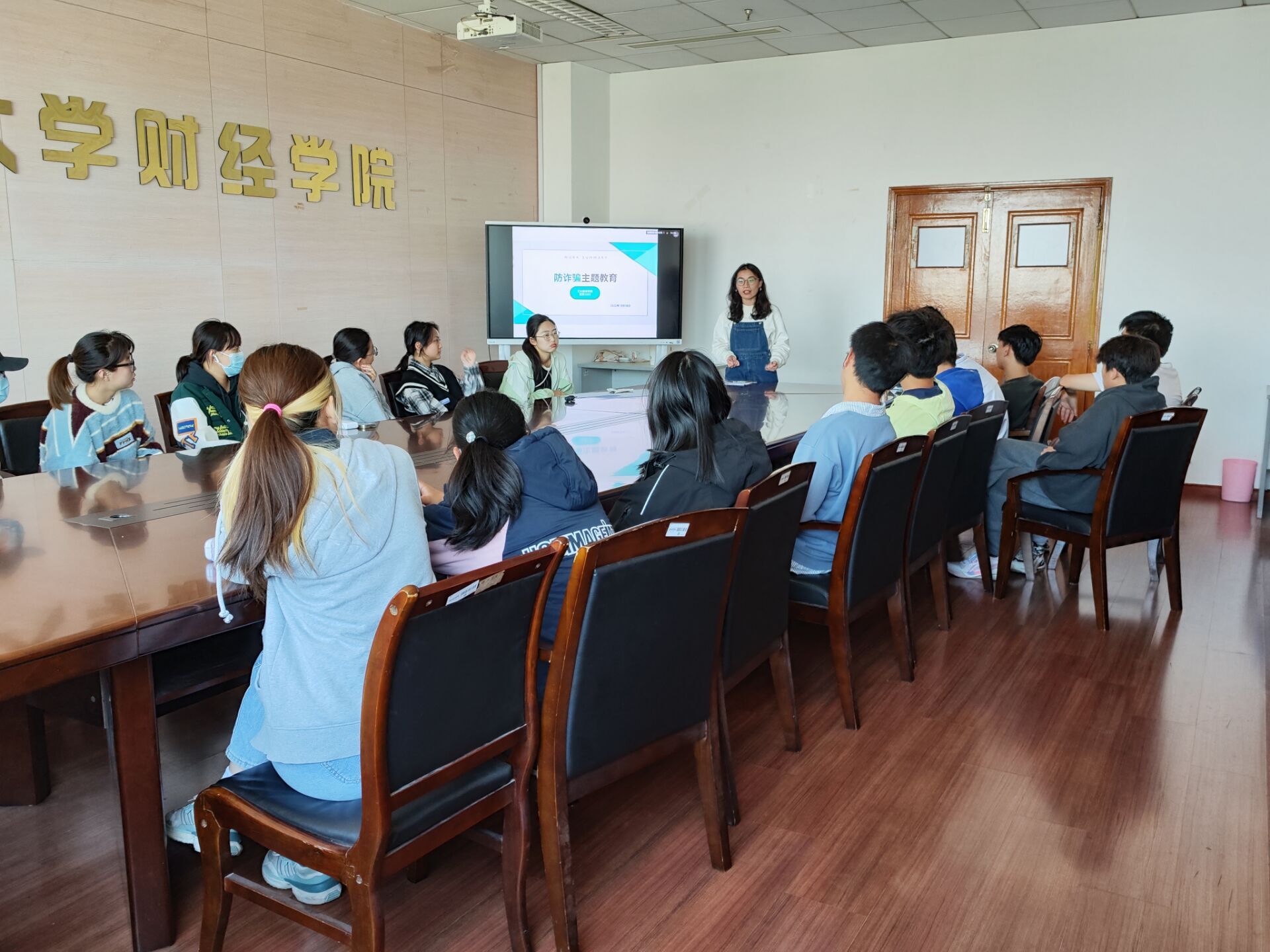 面对网络诈骗案例层出不穷,学生们屡屡受骗的状况,10月18日,财经学院国际经济与贸易2203班在三江楼1304C会议室开展防范电信网络诈骗主题班会,辅导员张颖参加此次会议。