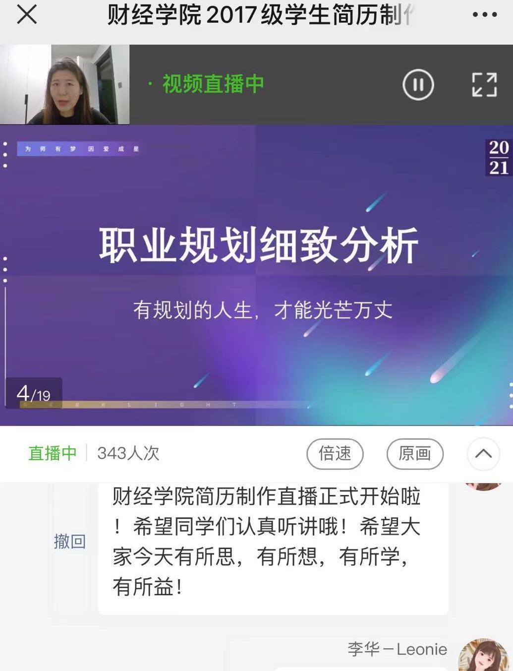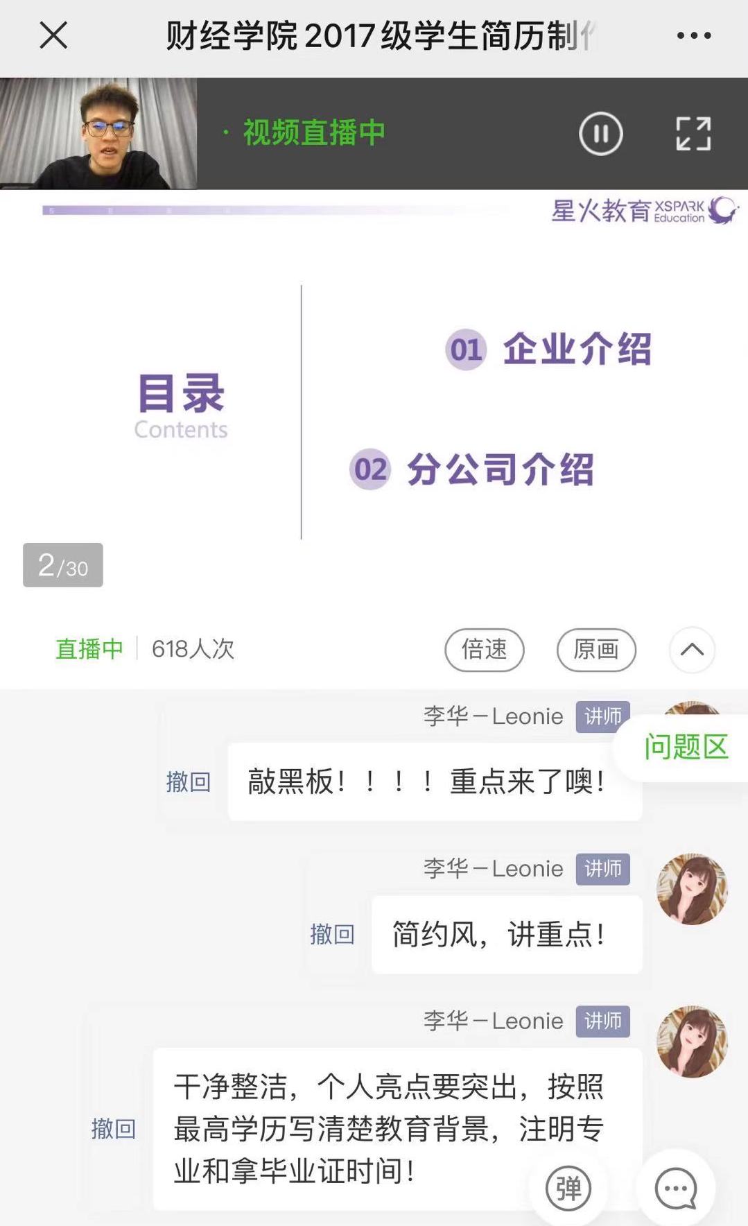 2021年1月23日晚19点,财经学院毕业生简历制作指导和就业宣讲会在直播平台成功举办。来自镇江星火教育人事招聘负责人李娟娟、市场总监余波,财经学院毕业生辅导员王艳慧、李华,及财经学院700余学生参与了本次线上直播。