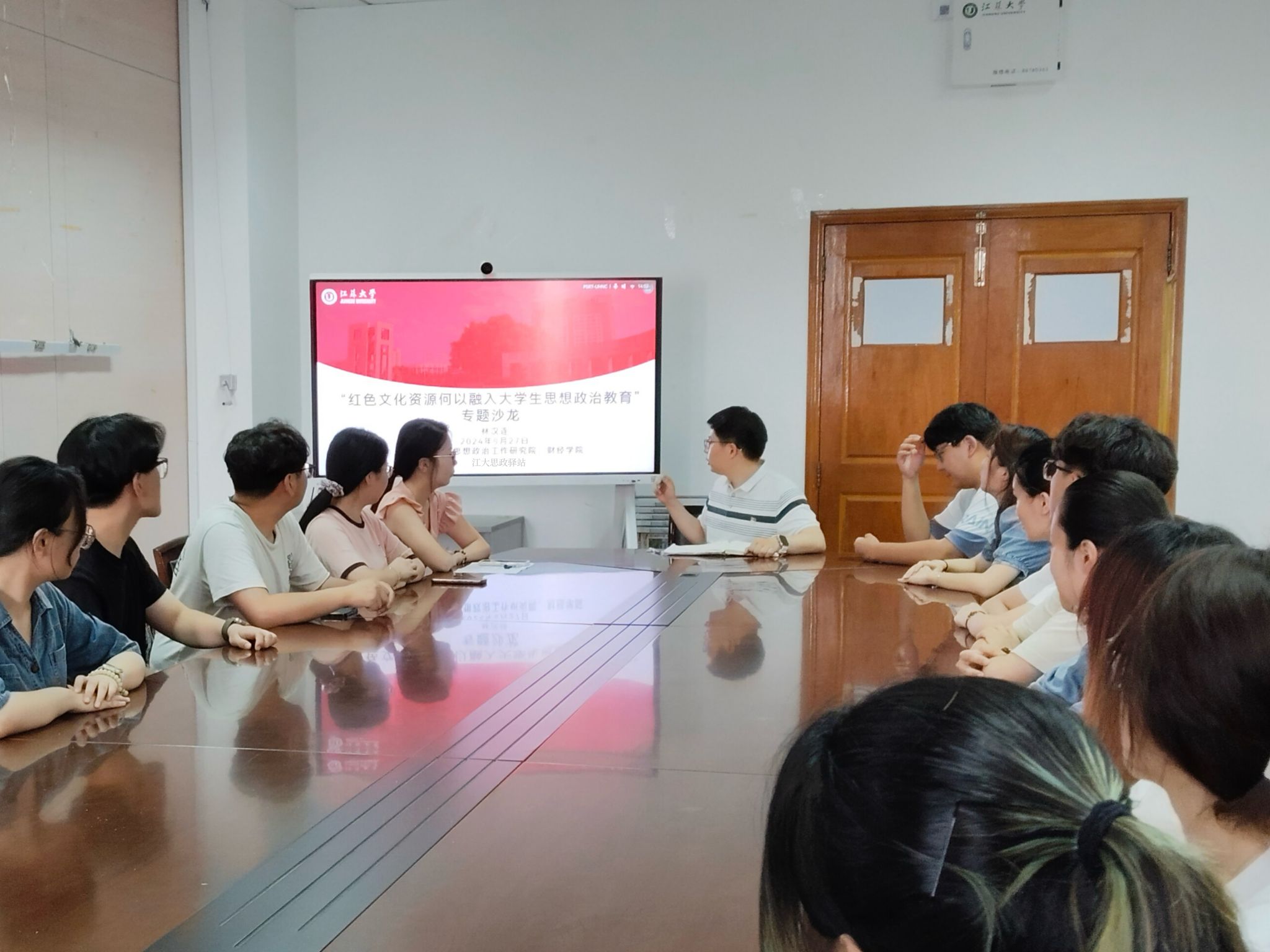 2024年9月27日下午两点,以“红色文化资源何以融入大学生思想政治教育 ”为主题的沙龙活动在财经学院三江楼1304D会议室顺利举办。本次活动由财经学院辅导员林汉连主持,江苏大学思想政治工作研究院(江大思政驿站)和财经学院精心组织,旨在将红色文化资源融入大学生思想政治教育中,培养大学生的爱国情怀和社会责任感。