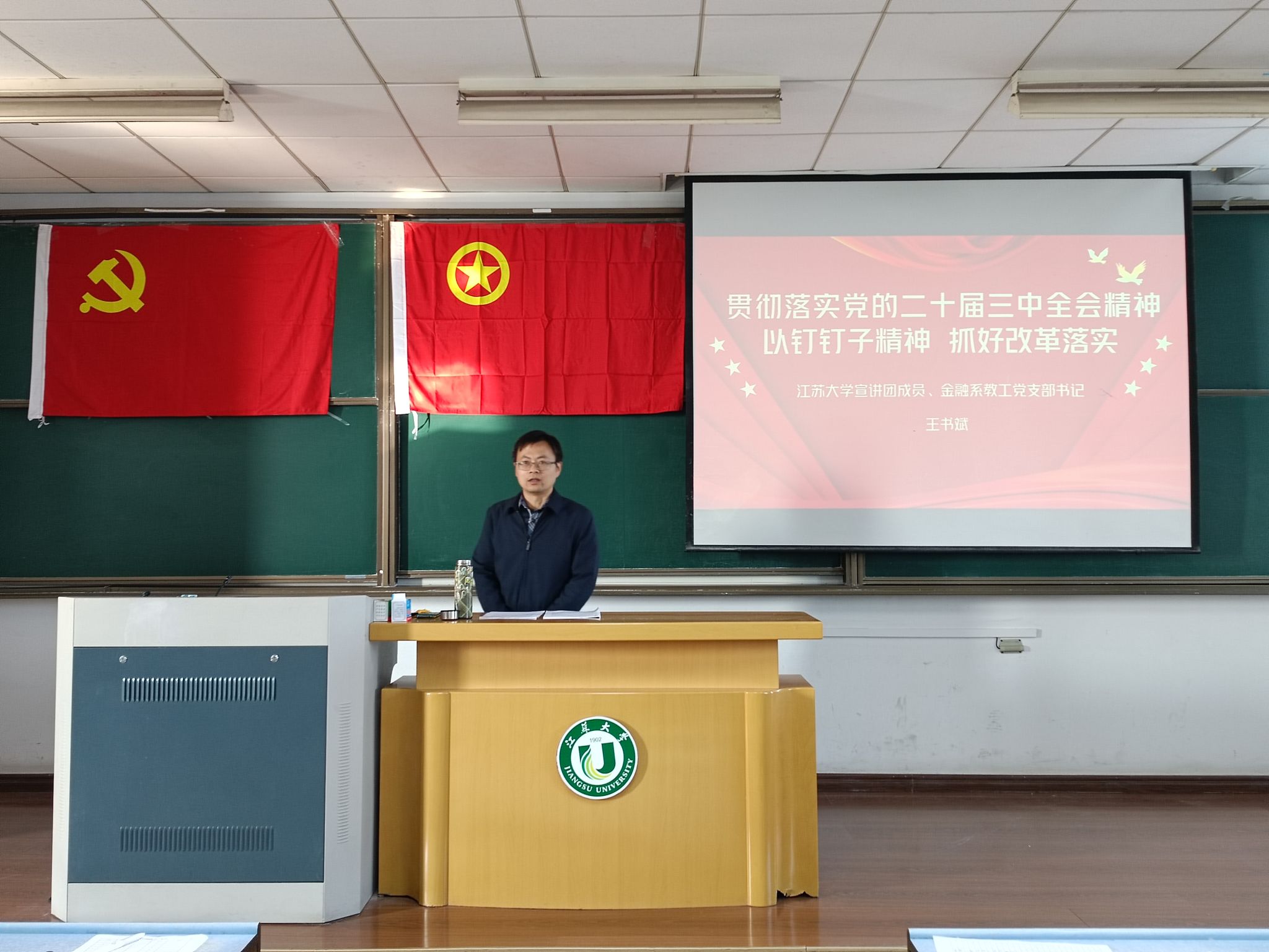 11月2日,财经学院在三江楼0701教室举办江苏大学青年共产主义学校第79期第三讲团课,团课邀请党的二十届三中全会精神宣讲团成员、金融系教工党支部书记王书斌主讲,学院150余名团学骨干参加讲座。