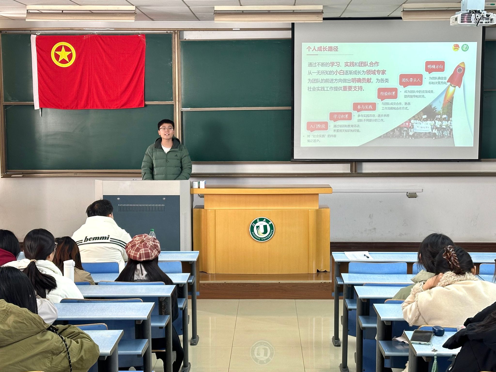 李清鑫则从“筹备”、“实践”、“感悟”三个维度,向同学们分享他的社会实践心得。在筹备阶段,他详细阐述了社会实践的组织流程、参与方式以及可能遇到的挑战和应对策略,并分享了如何有效获取资源、制定详细计划以及应对突发情况的经验,为同学们提供了实用的筹备指南。李清鑫分享了暑期社会实践优秀视频,带领同学们身临其境地感受了青年学子用双脚丈量大地、用爱心传递温暖的豪情。他特别提到,作为“青春献力,翱翔小岗”社会实践团队的一员,他亲身感受到了中国农村改革的巨大成就。在那里,他们看到了青年学子在乡村振兴中的担当与作为,也感受到了乡村因青年人的参与而焕发出的勃勃生机与活力。李清鑫鼓励同学们积极投身社会实践,用实际行动践行青春誓言。他提到,社会实践是青年学子成长成才的重要途径,也是实现个人价值和社会价值的重要方式。只有深入基层、深入群众,才能更加深刻地了解社会、认识国情,才能更好地为社会发展贡献自己的力量。