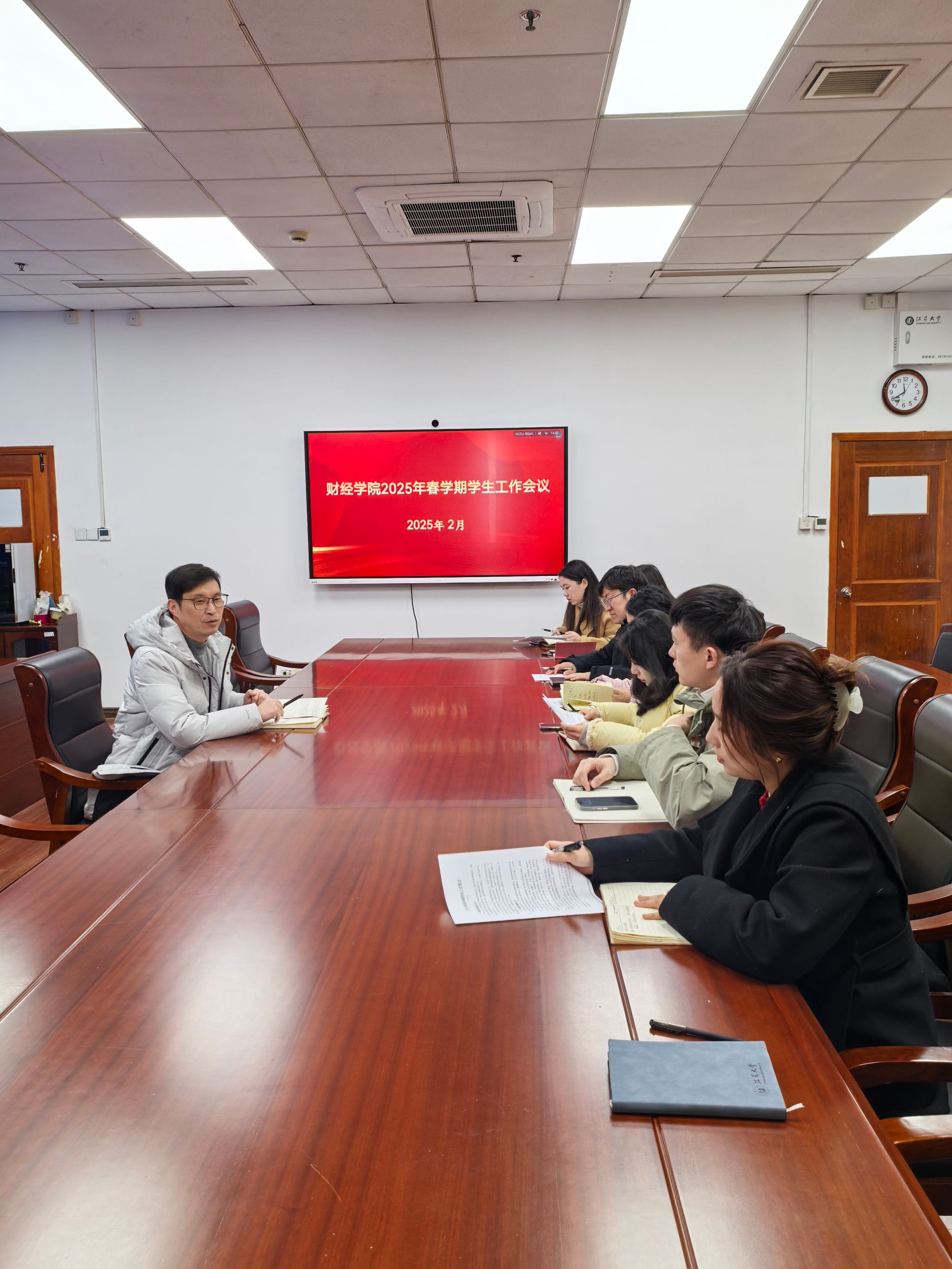为了更好地学习领会学校2025年春学期学生工作会议精神,2月17日,财经学院于三江楼1304D会议室召开学生工作会议,院党委副书记、副院长刘群东主持,学院全体专职辅导员参与。