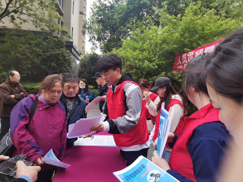 在此背景下,4月15日,江苏大学财经学院在国信宜和社区开展防范电信网络诈骗主题宣传活动。活动主要面向社区中老年群体,财经学院团委老师王艳慧与5名志愿者参与了活动。