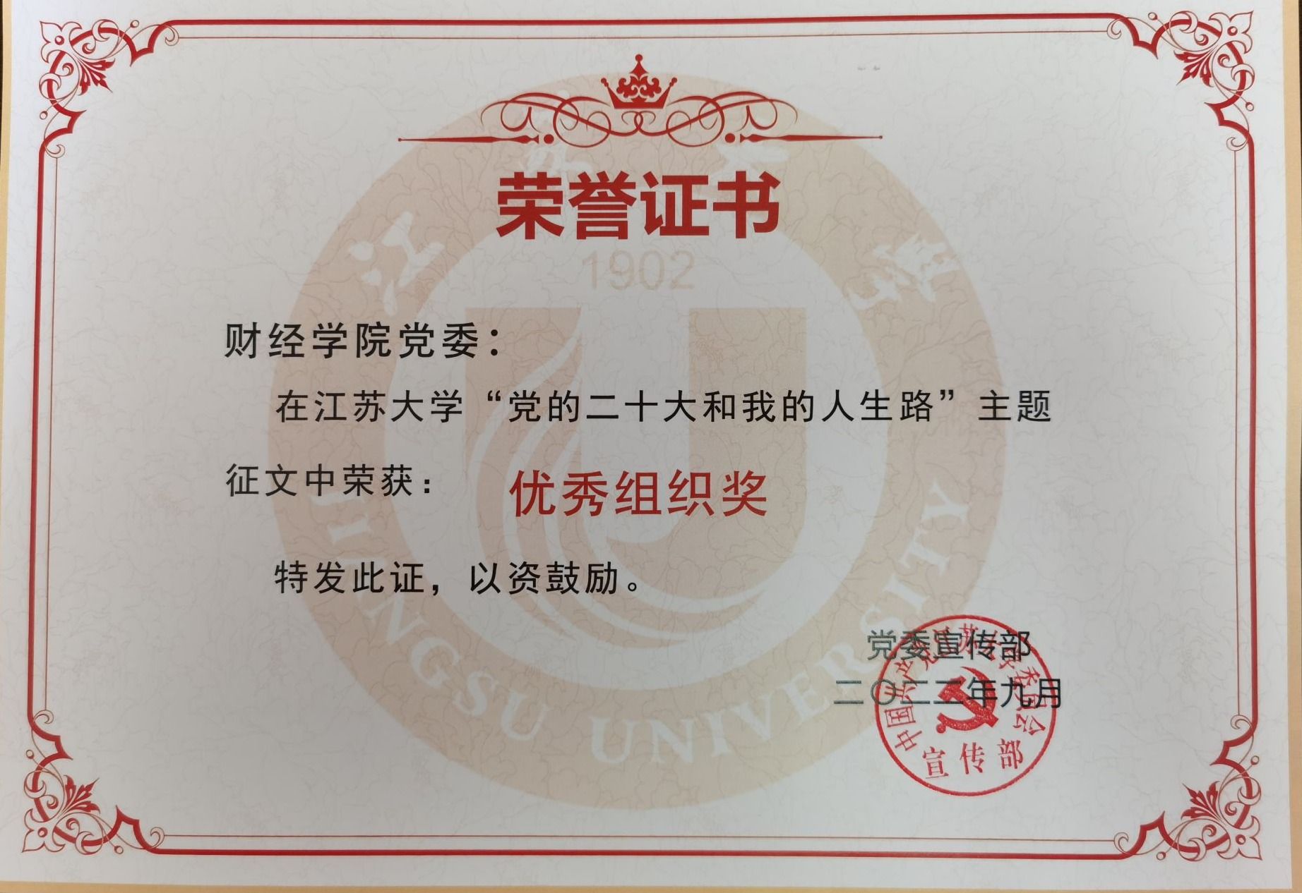 我院在江苏大学“党的二十大和我的人生路”主题征文比赛中荣获“优秀组织奖”。