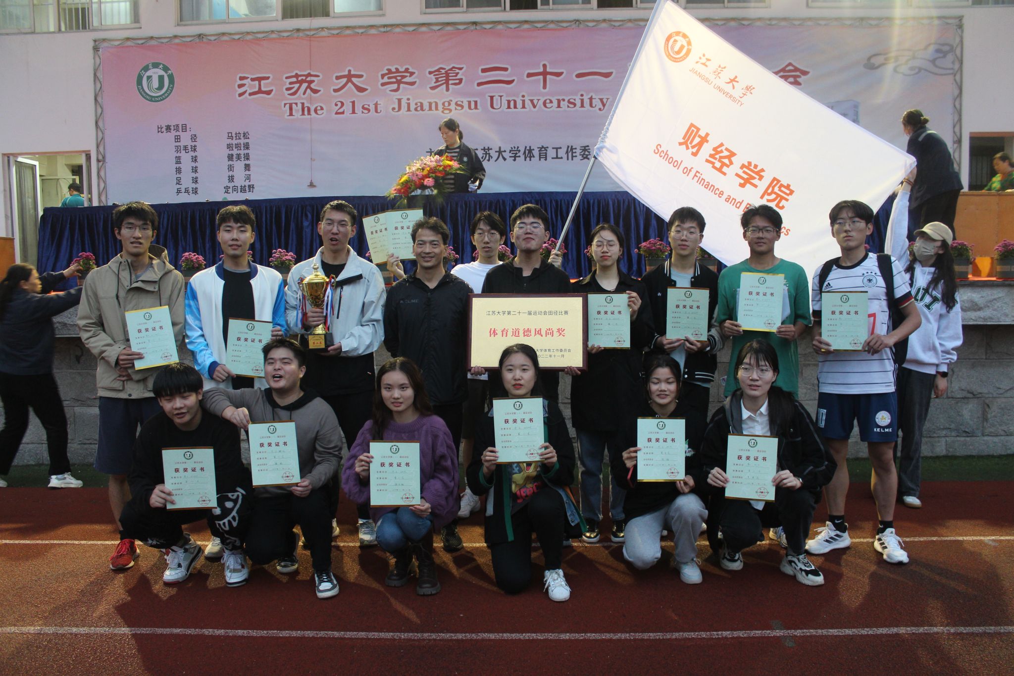 我校第二十一届运动会于11月11日至12日顺利召开,在学院党委、行政的正确指导下,运动员们团结一心、奋勇争先,我院荣获体育道德风尚奖,学生团队获得田径比赛团体总分第二、教工取得总分第三的可喜成绩!
