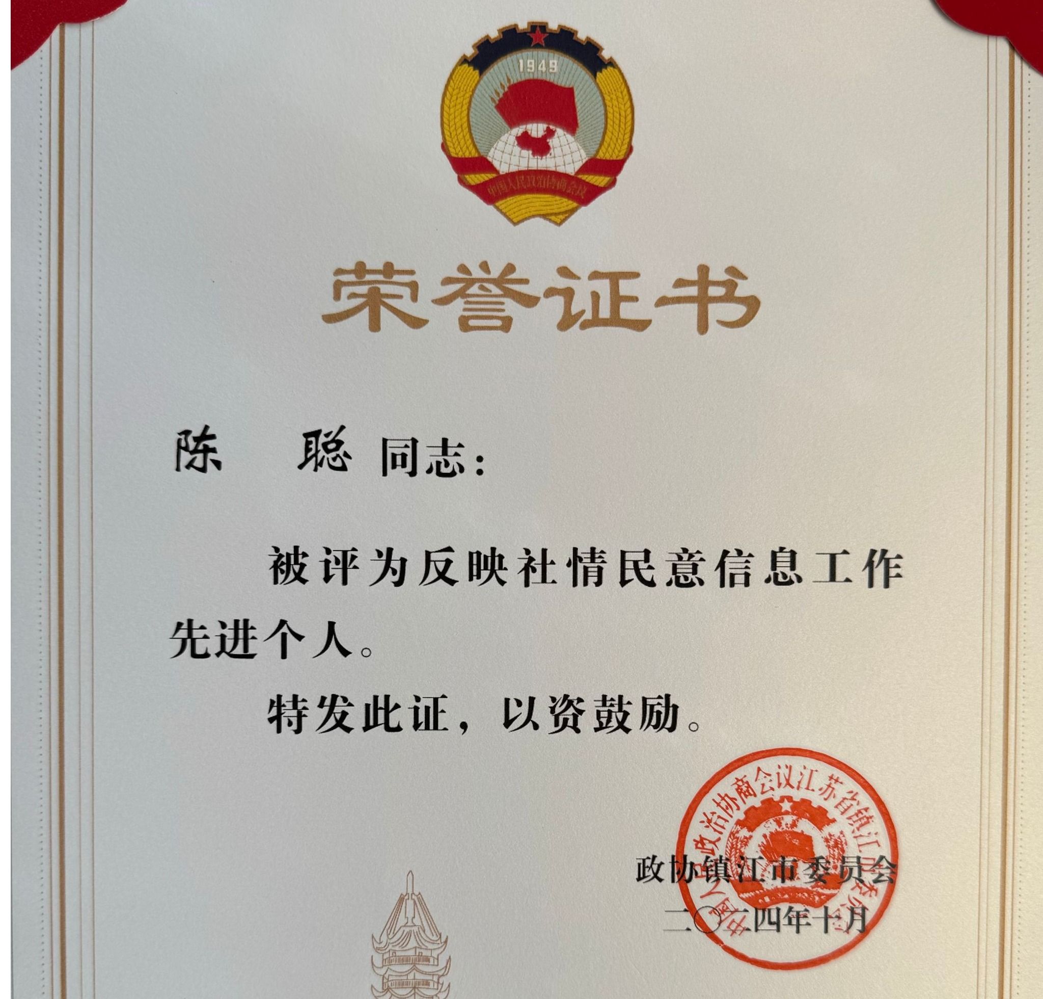 11月13日,镇江市政协召开全市反映社情民意信息工作会议,市委书记马明龙作出批示,市政协主席郭建出席会议并讲话。会议对反映社情民意信息工作先进单位、先进个人和优秀社情民意信息进行了表彰。江苏大学财经学院教师、民盟盟员、民盟江大委员会宣传委员陈聪博士被评为反映社情民意信息工作先进个人。
